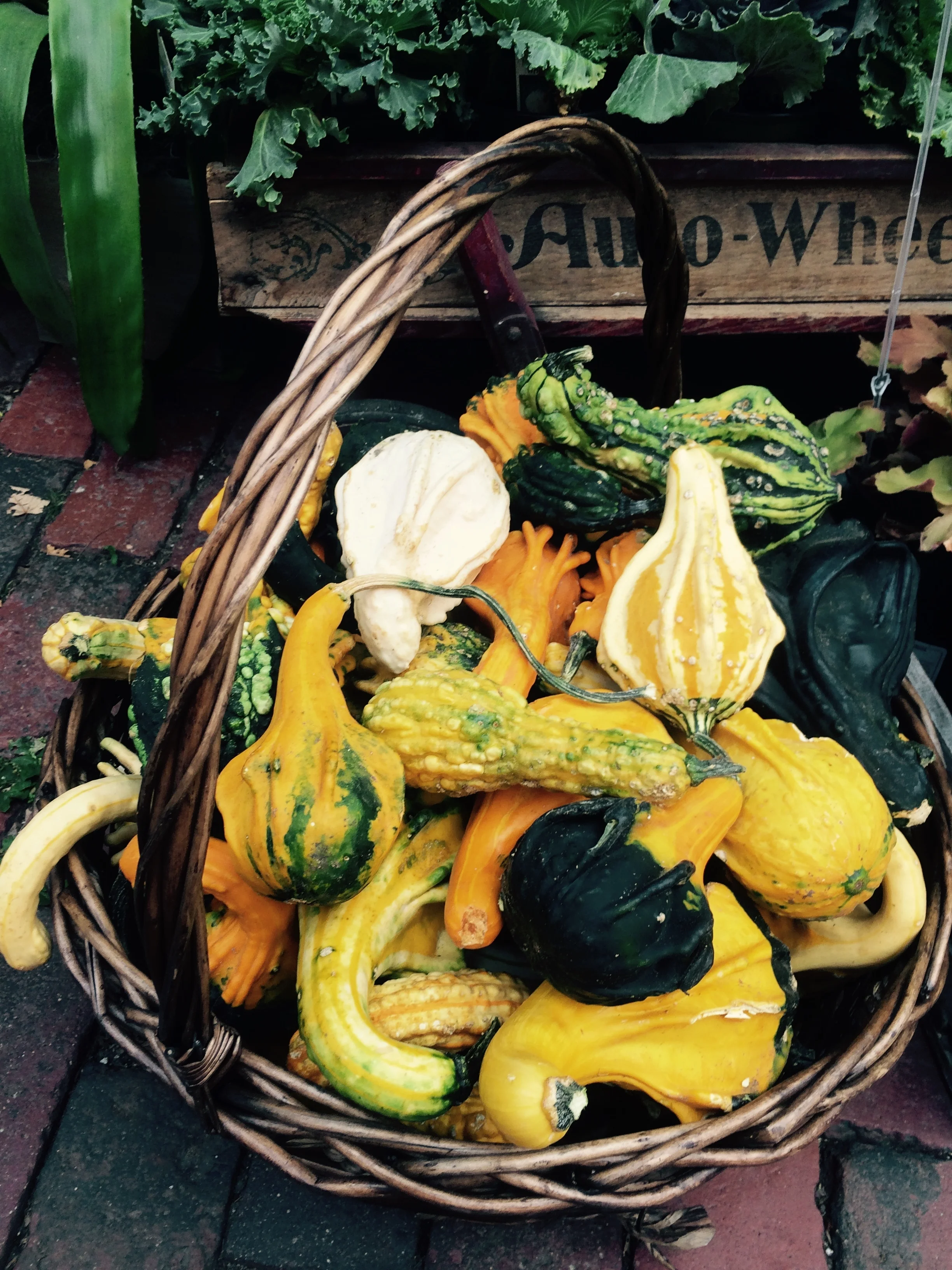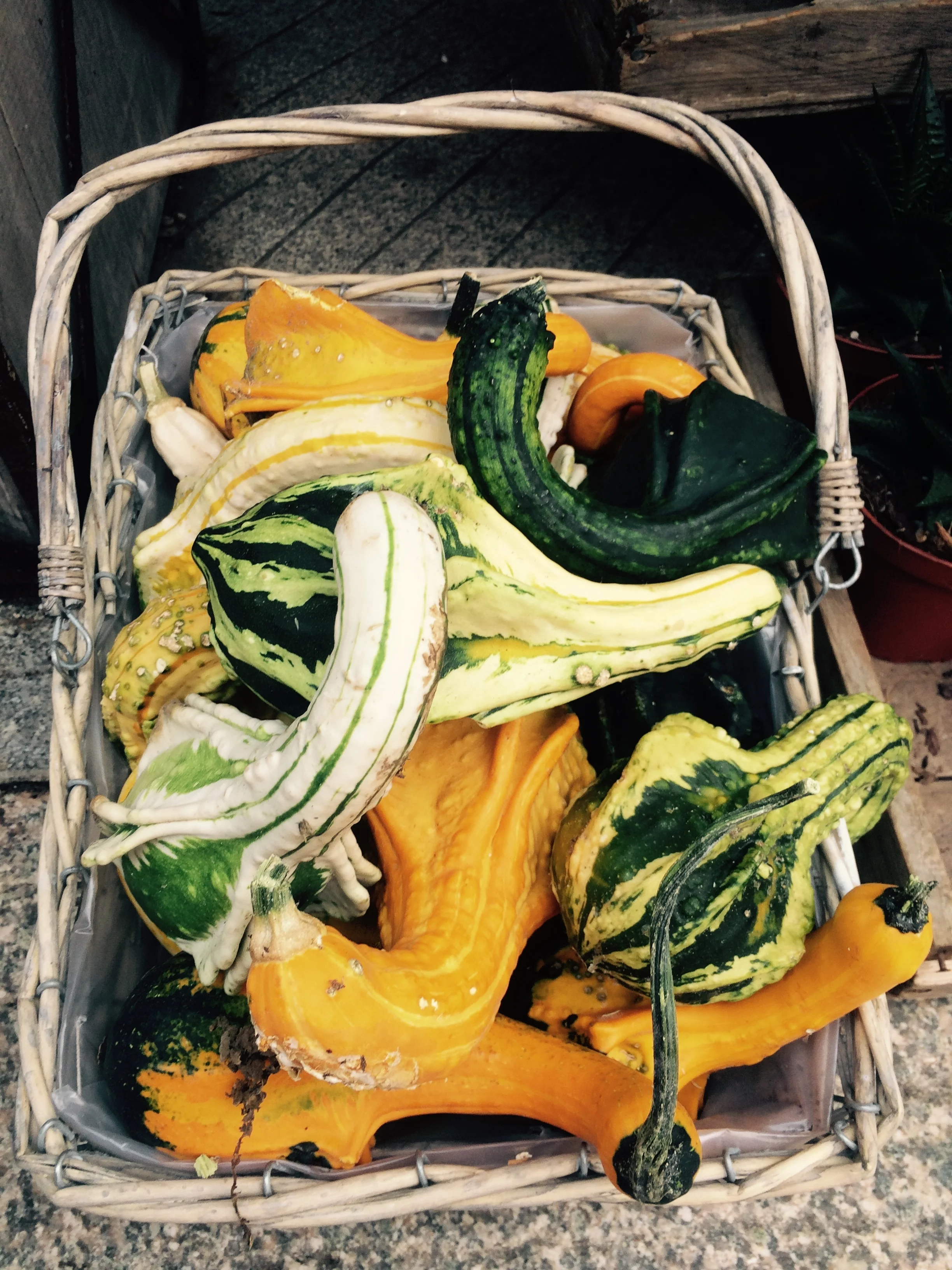 2. Colors- Gourds come in a whole bunch of colors that complement a lot of other fall foliage. My personal favorite are those that come in the bi-colored orange/gold and deep forest green.