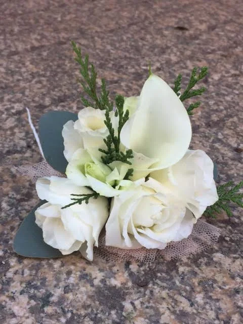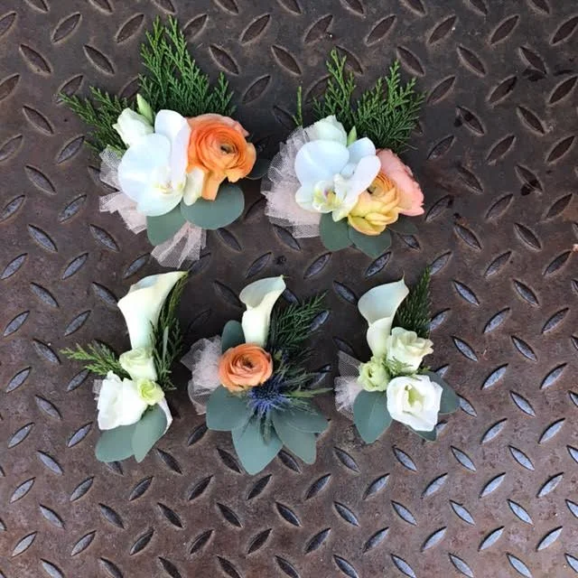 The boutonnieres and pin-on corsages for the groom and parents of the bride and groom. We tied elements of the bridal bouquet into the groom's boutonniere like the ranunculus and blue thistle.