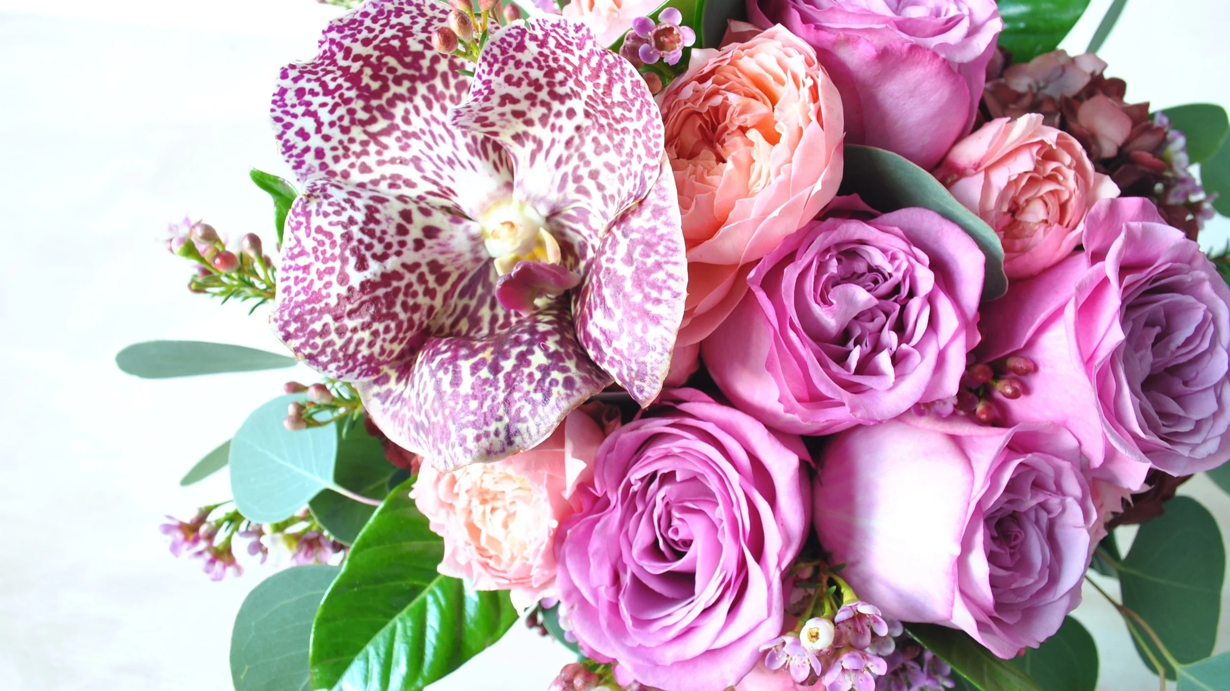 An arrangement that truly displays the sweet sentiments of affection. This beautiful and lush petite-sized arrangement features blush hydrangea, fluffy pink roses, spray roses, hints of wax flower all accented with a unique cymbidium orchid blossom and combined with lush green foliage nestled together into a blushed pink glass container.